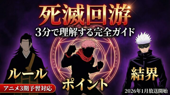 『呪術廻戦』の中でも特に複雑で難解とされる「死滅回游」。2026年1月から放送が予定されているアニメ第3期「死滅回游編」を最大限に楽しむため、その全体像、目的、そして複雑なルールを3分で理解できるよう、図解を交えて徹底解説します。