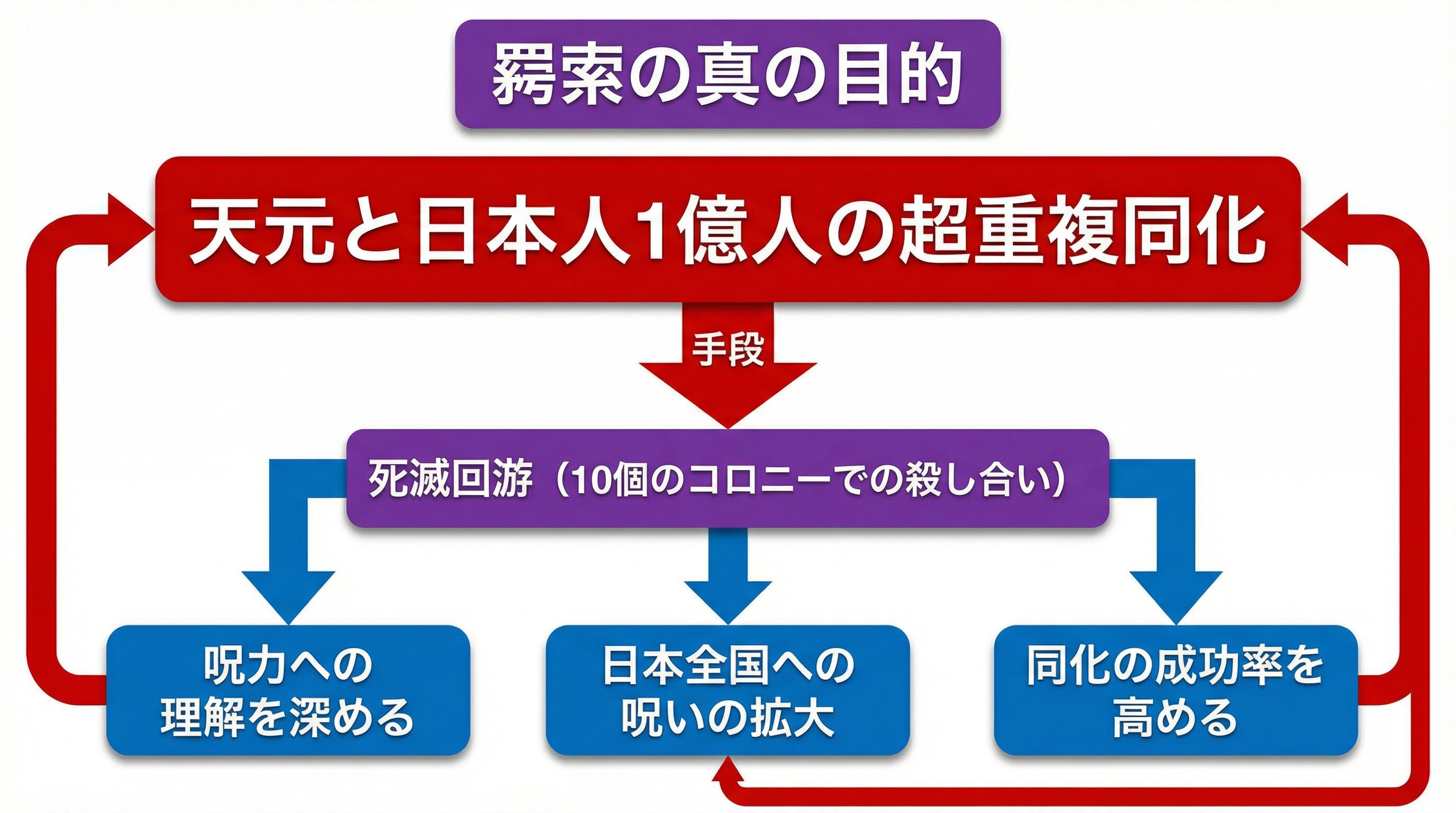 この図が示すように、羂索は死滅回游を通じて日本全土の呪力を高め、同化儀式の成功率を上げようと計画しています。つまり、参加者たちの戦いは、羂索の壮大な野望を実現するための布石に過ぎません。