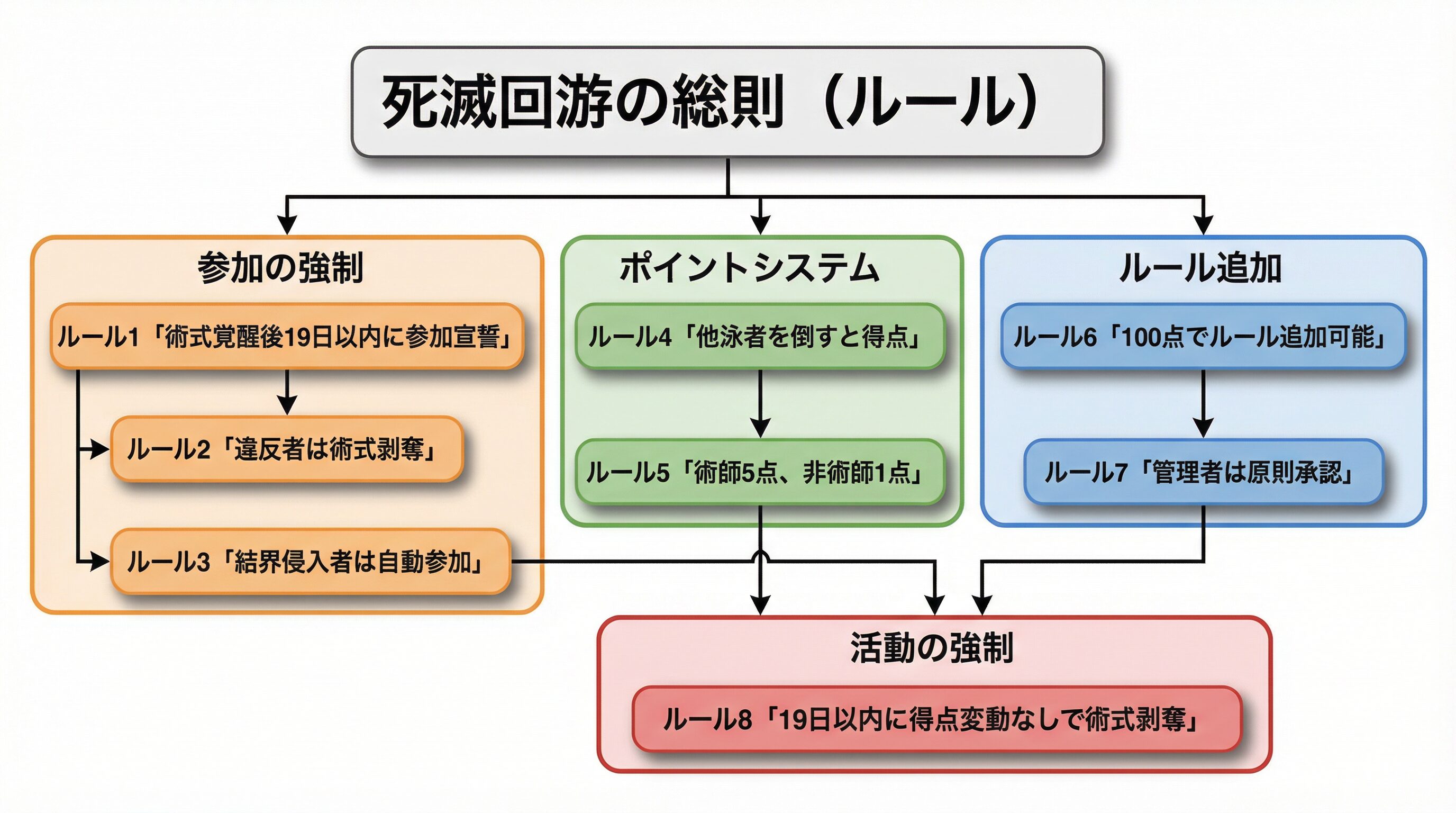 特に重要なのは、参加の強制性と活動の強制性です。術式に目覚めた者は19日以内に参加しなければならず、参加後も19日以内に得点を変動させないと術式を失います。これにより、泳者(プレイヤー)は否応なく戦いに身を投じることを強いられるのです。