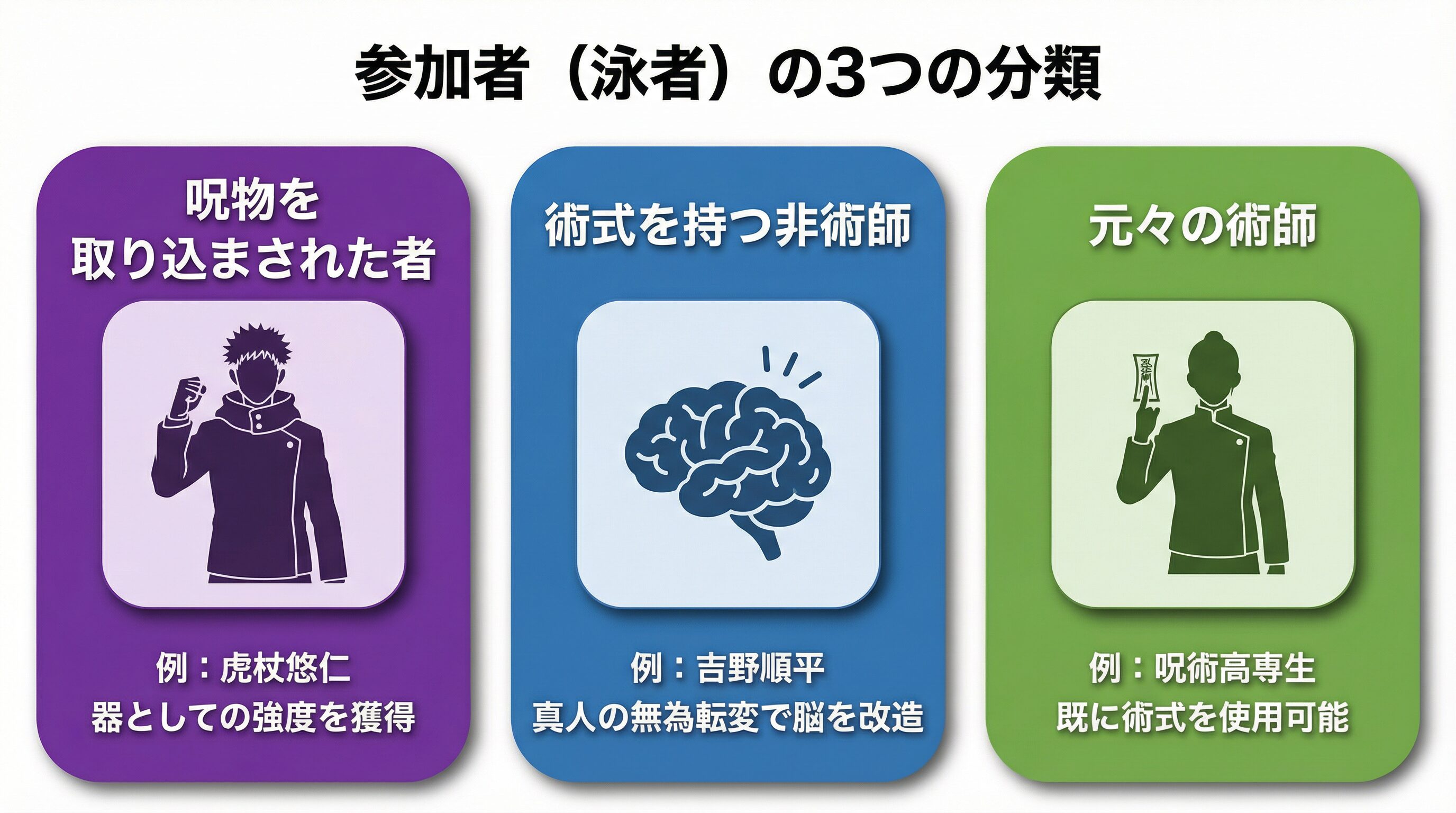 死滅回游の参加者は、その出自によって大きく3つのカテゴリーに分けられます。羂索が「千人の虎杖悠仁を放った」と表現するように、多様なバックグラウンドを持つ者たちがこのデスゲームに集められました。